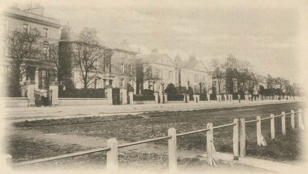 Shooters Hill Road in about 1905. In 1901, Thackeray moved with his wife and two children into one of the semis in the row that runs from the centre to the right of the picture. His house was the fifth one in the row from the left. In this view, it is largely obscured by trees. His wife died in 1902 and his son in 1904. The 1911 census shows him living in the house with his daughter, a cook and a house parlour maid. From a postcard (527) by Perkins, Son, and Venimore (PS&V)