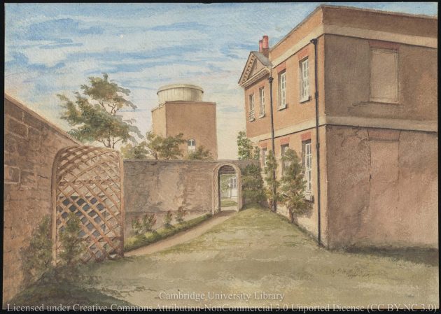 A contemporary view of the Meridian Building from the south. Located on the first floor, the two windows of the Chronometer Room are located beneath the triangular pediment on the right. The left hand window of the pair has what could be a 'pent-house' fitted in-front of the lower sash. Pencil drawing dated 28 May 1838 by Airy's sister-in-law, Elizabeth Smith. Reproduced under the terms of a Creative Commons Attribution-Non-Commercial 3.0 Unported License (CC BY-NC 3.0) courtesy of Cambridge Digital Library (see below)