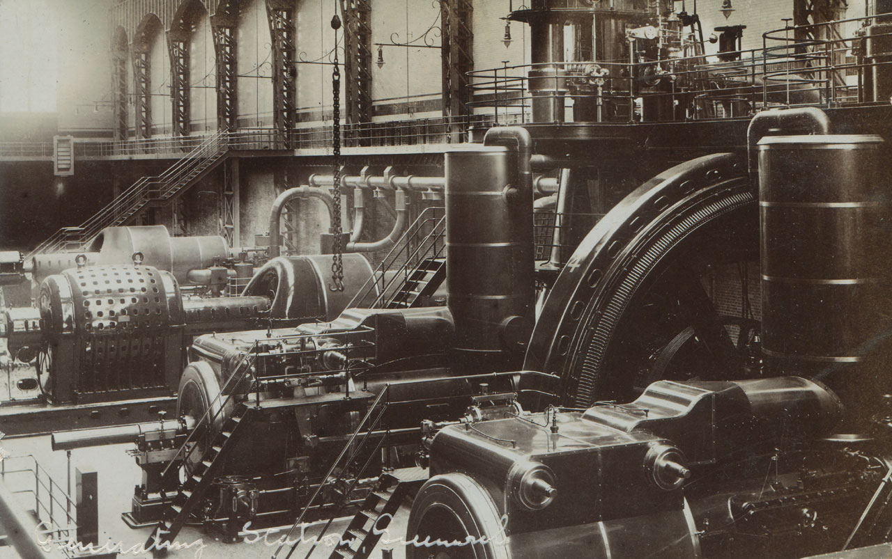 The Engine House in 1906. In this south facing view, several of the 3,500 Kilowatt Musgrave & Sons generators are visible, together with the large flywheels, which had a diameter of 27 feet. The wall at the far end was temporary and clad with corrugated iron. It was removed prior to the completion of phase two (which was built on its far side). The photo was reproduced in several contemporary publications. This version is from the 1 June 1906 edition of The Engineer and is reproduced courtesy of Grace's Guide under a Creative Commons Attribution-ShareAlike License (see below)