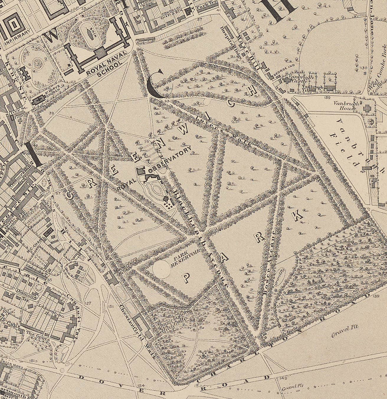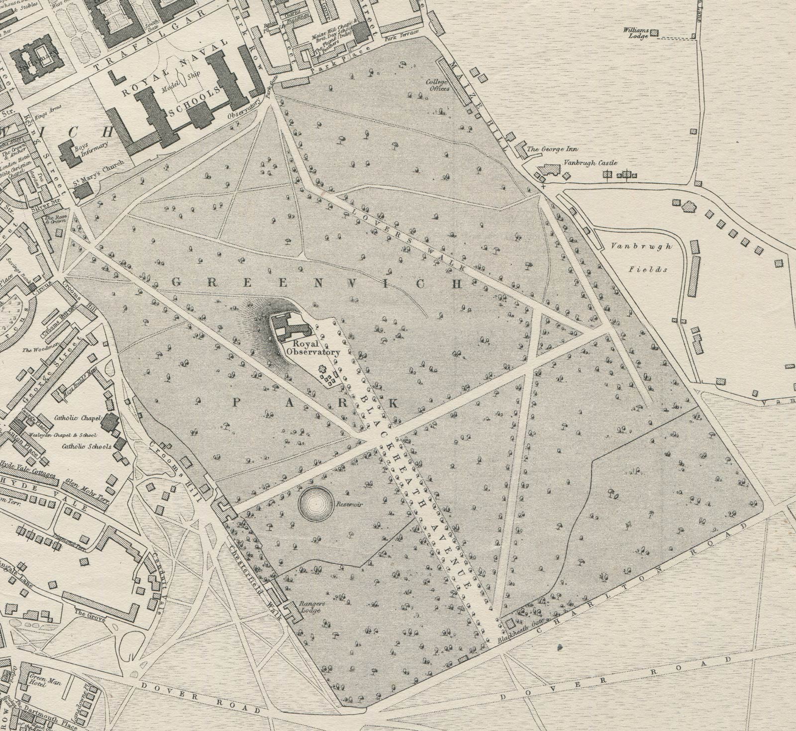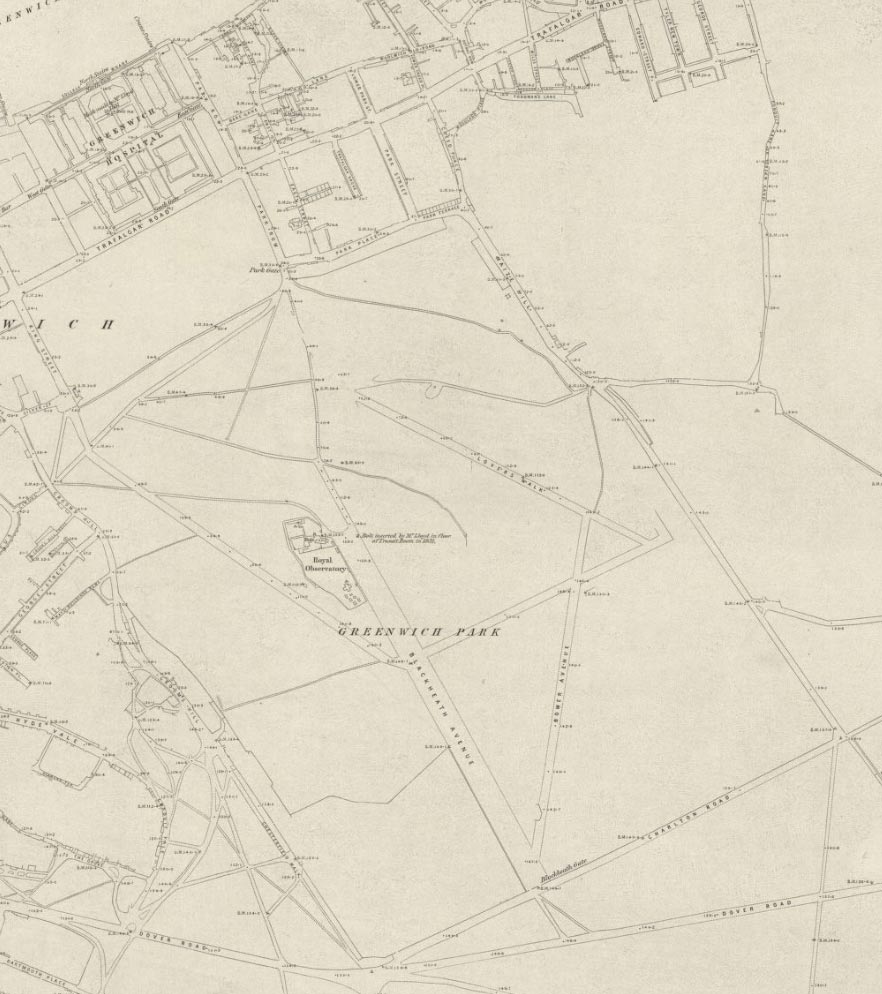 Rather curiously, although the Blackeath Gates are marked, no point of entry into the Park is shown at this point. Just two avenues are named: Blackheath Avenue and Lovers Walk. Although other contemporary plans show that tree lined avenues shown in the 1850 Sayer Plan were still largely intact, several have been ommited on this Plan which appears only to be showing those that have an obvious path along them suggesting that parts of it were copied from the 1848–50 Ordnance Survey Plan which probably explains the reason for the incorrectly orientated eastern Terrace Walk.