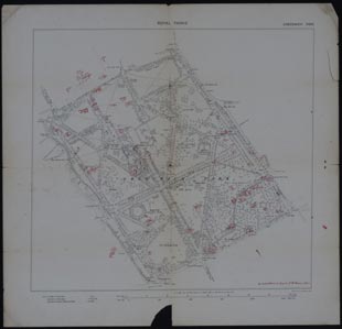 Click here to view a larger pdf version on the Royal Parks website. This particular copy was used to show the location of all the bombs that dropped on the Park during the Second World War, some of which caused damage to the Observatory buildings.