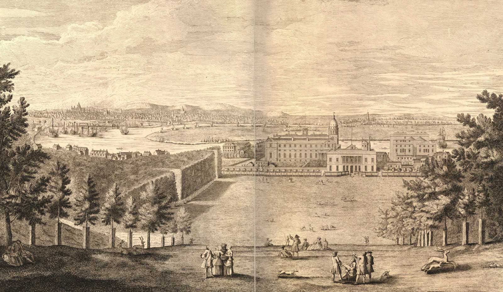 Urbis Londiny Fluvy Thamesis, Templi Palaty, Viridary Greenovicensium ab Austro Conspectus engraved by Claude Dubosc after Alexander Gordon and published in 1731. Note the newly planted trees on the edge of the Giant Steps whose trunks have been encased to protected them from the deer. © The Trustees of the British Museum (CC BY-NC-SA 4.0). Museum Number: 1880,1113.5519 (see below)