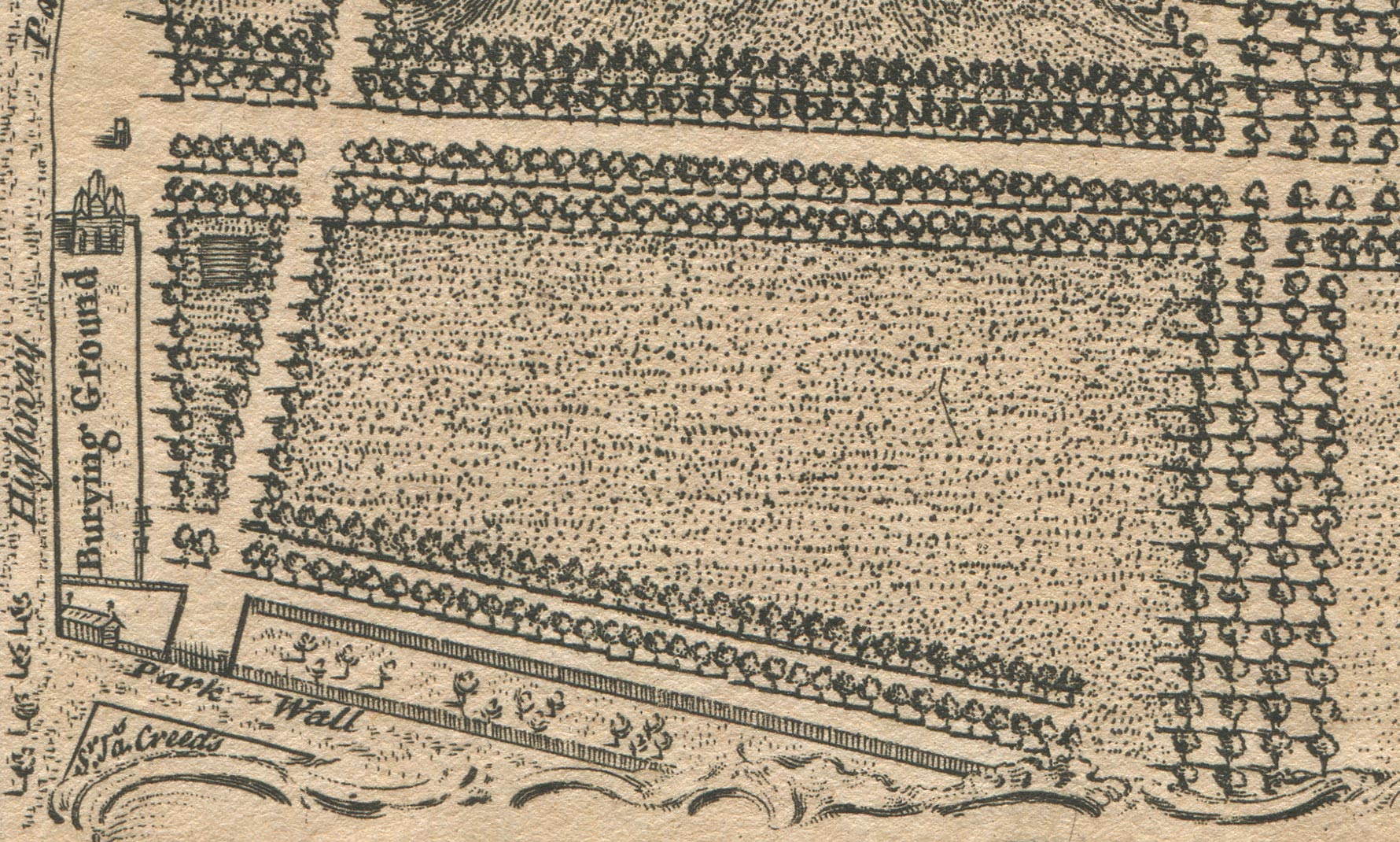 Unlike the Rocque Map on which it is omitted, The London Magazine Plan shows the burial ground created in 1707 on part of the site of the Dwarf Orchard that had been laid out in the northeast corner of the Park by William Boreman during 1661–2. It seems to be the only plan that does so. More than that, at the southern end of the burial ground, it shows what may be the only surviving image of the Mausoleum that was built under the supervision of Nicholas Hawskmore in 1713–14. It also shows the only known (albeit not very clear) depiction of the pyramidal conduit house once existed at the eastern end of Cross Avenue (just to the north of One Tree Hill), and is the earliest known plan to do so.