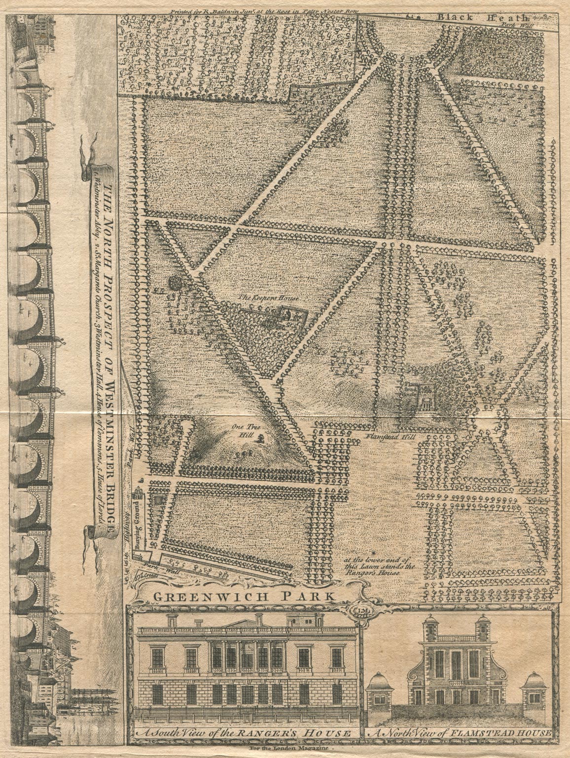Engraved on copper, the printed area measures about 25cm x 19cm. Neither the surveyor nor the engraver is named, but we do know from the engraving that the plate was printed for R. Baldwin Junr. at the Rose in Pater Noster Row for The London Magazine. To make everything fit, the engraver has partly cropped the edges of the Park (half the boundary wall is missing on the top, bottom and left edges and missing in its entirety on the right).