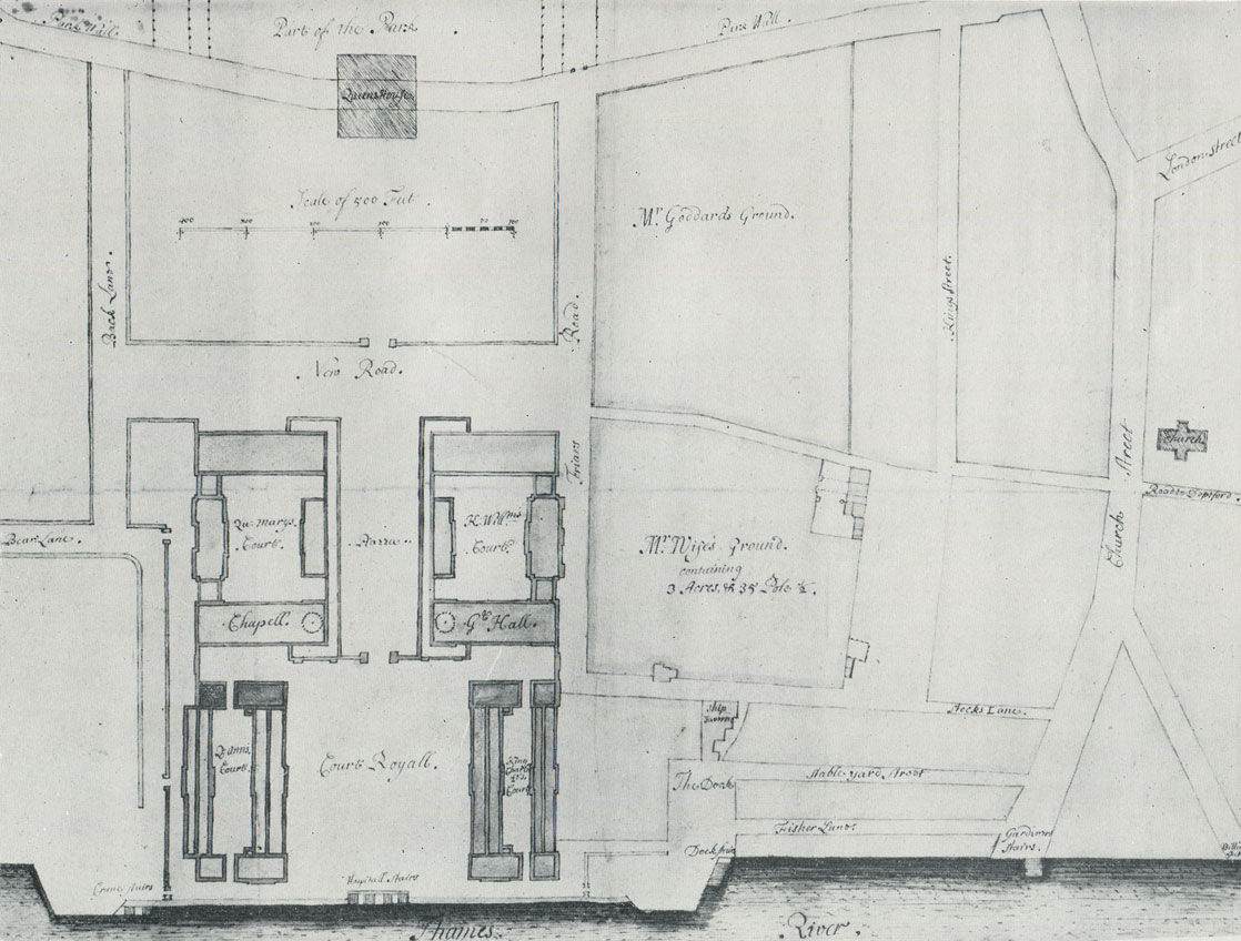 The catalogue entry states the Plan was drawn by Joel Gascoin (Gascoyne?). Although his name does not appear to be present on the Plan itself, the form of the compass rose is similar to those on other plans he is known to have drawn. It also has a typically elaborate Cartouche.The Plan has misshapen features of which the most obvious is the lopsided Parterre immediately to the south of the Queen's House which still has the roadway running beneath it.