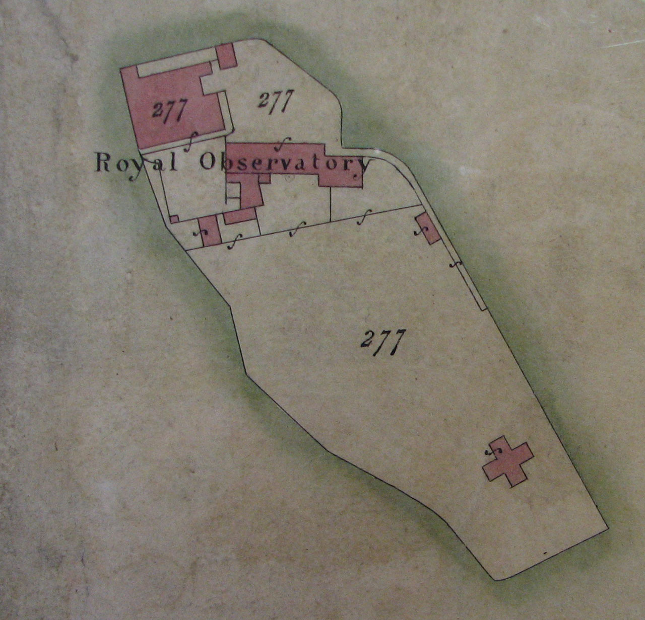Copies of the Plan exist at both The National Archives (Work 32/691) and the RGO Archives (RGO6/610). The RGO copy has been marked in red to show the route proposed in January 1852 for the installation of underground galvanic cables for the sending of time-signals from the Observatory to the galvanic telegraph of the South Eastern Railway (which was along Blackheath Avenue turning right into the Great Cross Avenue and out of the Park via the path between The White House and Macartney House and ultimately across Blackheath to Lewisham Station).